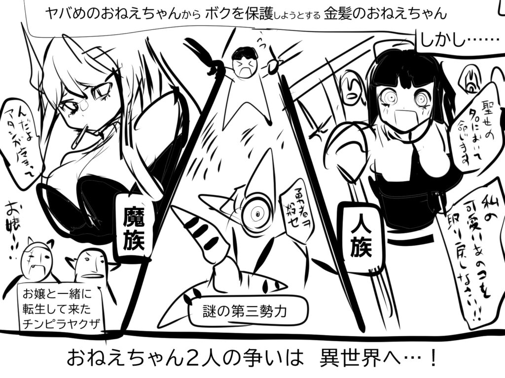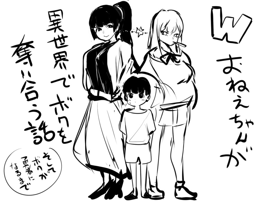 1つ目、タイトル未定「Wおねえちゃんが異世界でボクを奪い合う話」。横長画像にしたため、コミック形式が向かないため画像として貼ります。