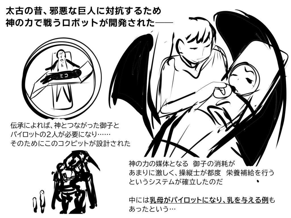 無理矢理「授乳型コクピット」を作ったのだからとことんエロバカで行けばいいじゃないか感もある企画ですが、コメディで突っ走るのがあんまり得意じゃないのもあって、とにかく授乳型コクピットは絵面で使っていく感じになる企画です。例えるならダーリンインザフランキスみたいな……