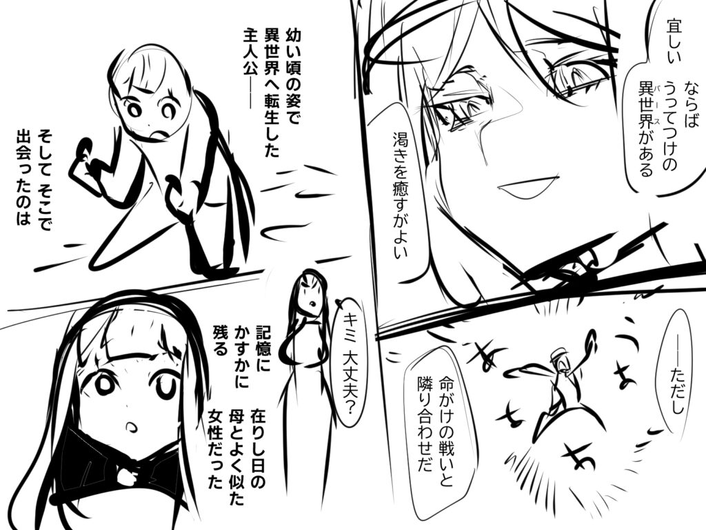 ファンタジー背景が手描きできる強みを活かすとしたらファンタジーのほうがいいのと、なんかド迫力バトルを描きたい欲求があります。